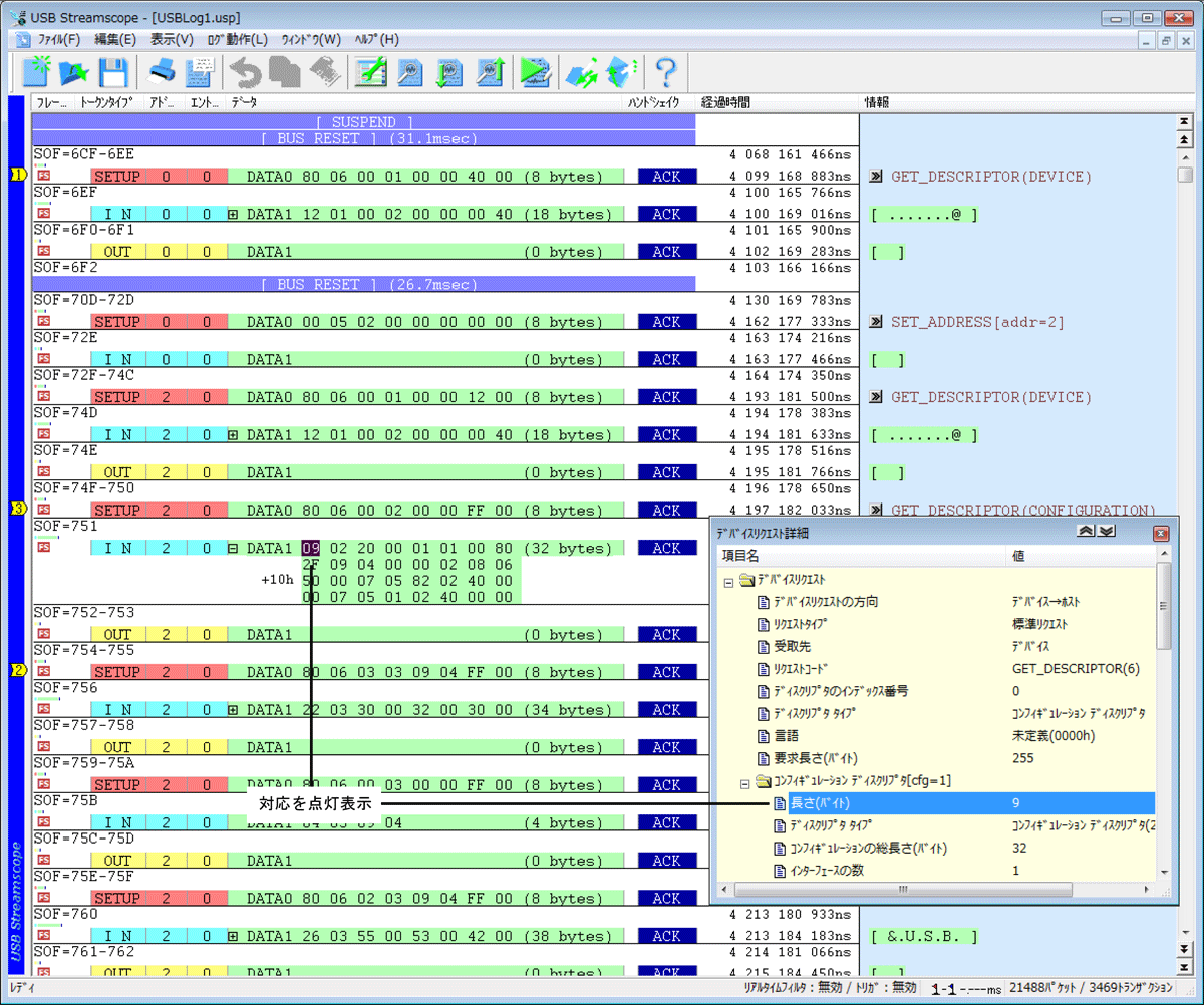 USBパケット・トランザクションの明快な表示だけではなく、標準ディスクリプタ、デバイスリクエスト、 クラス固有のデバイスリクエスト(注1)などの詳細な翻訳表示に対応しており、 難解なUSBプロトコルの理解を手助けします。